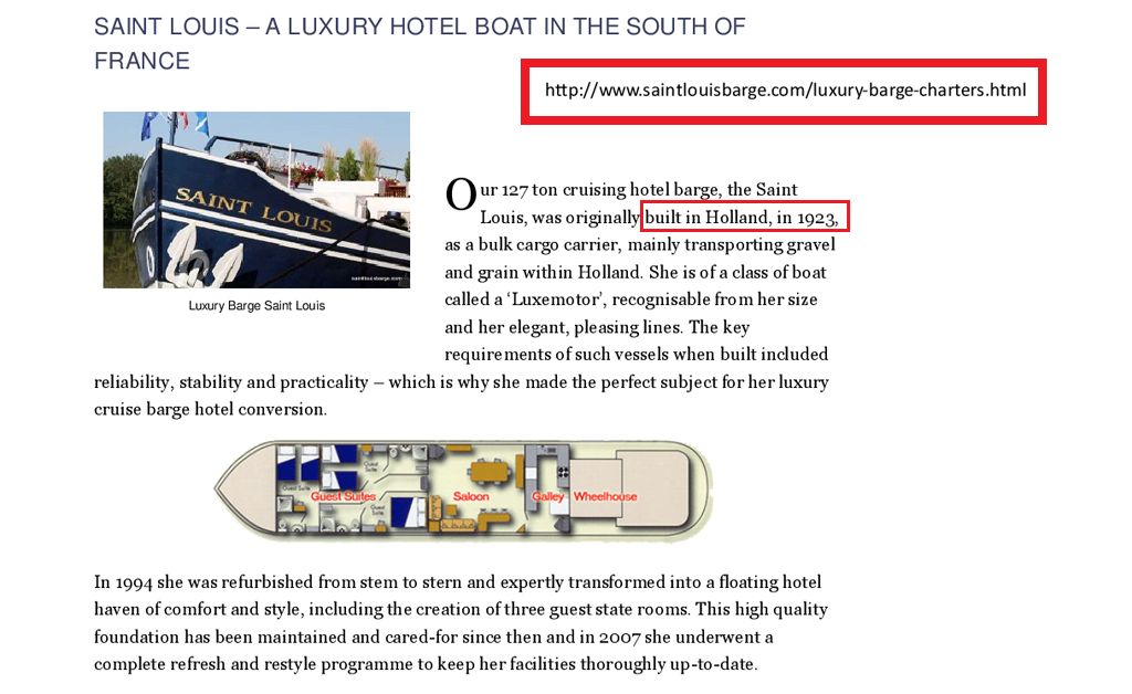 ‘’Construit en 1923 par Gebroeders Boot à Alphen aan den Rijn aux Pays-Bas, le Saint Louis était un vraquier et a servi sur les mers intérieures et les voies navigables néerlandaises transportant des cargaisons de céréales et de gravier jusqu'en 1985 environ. À cette époque, il a été converti pour être utilisé comme navire de ravitaillement dans le port d'Amsterdam, sous le nom de Supplier 2. En 1994, il a été vendu puis transformé en péniche hôtelière.’’