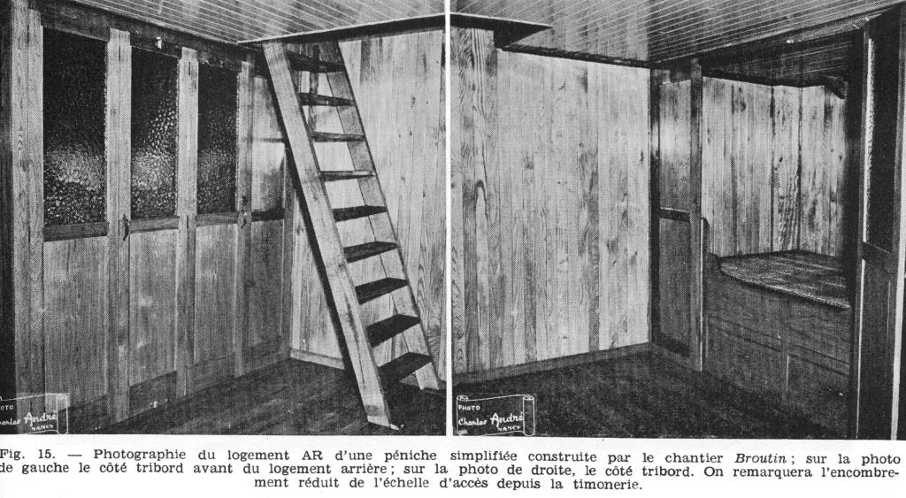 Extrait d'un article de H. de Gorriainoff, ingénieur civil du Génie maritime, publié dans la Revue de la navigation intérieure et rhénane du 10 avril 1955, voici un plan et deux photos des aménagements arrières d'une péniche simplifiée construite pour la SRPF par le chantier Broutin de Laneuveville-devant-Nancy :