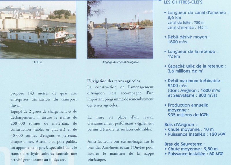 "Au premier semestre (1973) , on constate que dorénavant, le passage se fait par le nouvel aménagement d'Avignon. Il est constitué par l'écluse-usine de Villeneuve-les-Avignon, le barrage usine de Sauveterre sur l'ancien Rhône, et un autre barrage sur le bras de Villeneuve. L'originalité de ce plan consiste à utiliser comme portion navigable, l'ancien bras mort de Villeneuve (en rive droite, comme à Beauchastel), au lieu de la grande boucle d'Avignon. C'est à dire que maintenant, les bateaux passent à l'ouest de l'île Piot et de l'île de La Bartelasse. La dérivation est donc très courte, et permet de gagner plus de quatre kilomètres. La passage du côté d'Avignon devient un cul de sac mais permet néanmoins d'atteindre, le dépôt d'hydrocarbures du Pontet et le port de L'Oseraie grâce à la remontée d'eau du barrage aval de Vallabrègues." ....Mais aussi parce que, pour la première fois, le barrage de retenue, de Sauveterre, est équipé d'une turbine qui permet de laisser passer l'eau sans perdre son énergie.