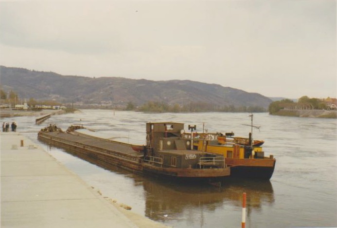 Une photo couleur inédite de Ecureuil, bientôt sous devise Azais (tout fraichement acheté à l'époque, dans les années 60), avec l'Ampère au quai de Tournon sur Rhône.