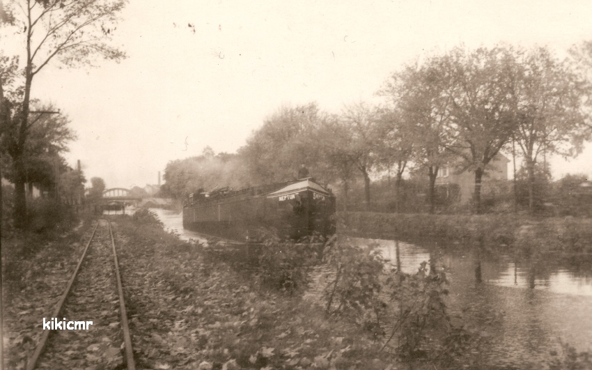 Pour la localisation : la voie de la traction, sur le chemin de halage, est à écartement de 0,60m, c'est donc en Alsace, sur le réseau de la Traction de l'Est, puisque le réseau de la CGTVN était à écartement métrique. Est-ce le canal du Rhône au Rhin, branche Nord ? Il y a un pont et une cheminée d'usine à l'arrière-plan, une maison sur la droite, peut-être que ces indices permettront à quelqu'un de situer plus précisément la scène.