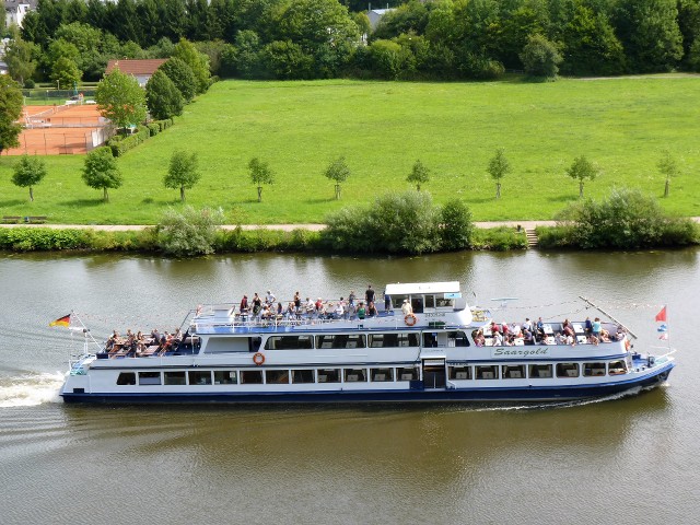 Saargold , 38,40 x 5,80 x 1,00 , Bouwjaar 1963 , Werf Lux Werft in Mondorf ( Duitsland ) , 2 x 260 pk MAN , ex Beethoven , ex Mussel II , eigenaar Saar Personenschifffahrt ( Hauck ) in Saarburg , ENI 04805240.