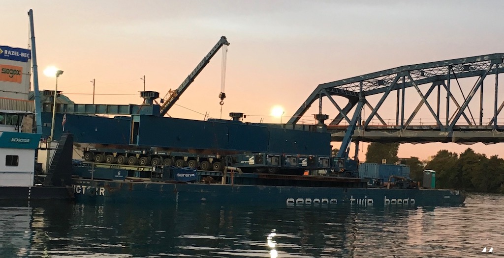 Deux petits films, en timelapse, la rotation du pont sur la barge, et le déplacement vers le quai ou le pont sera découpé: