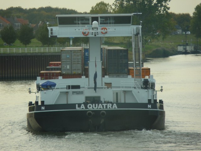 La Quatra , 134,97 x 15,04 x 3,20 , 4225 ton , Bouwjaar 2001 , Werf casco in Hemiksem ( Belgie ) , 2 x 1800 pk ABC en 2 x 470 pk Cummins van Wijk boegschroef , eigenaar La Quatra BV in Hendrik Ido Ambacht , ENI 06003644