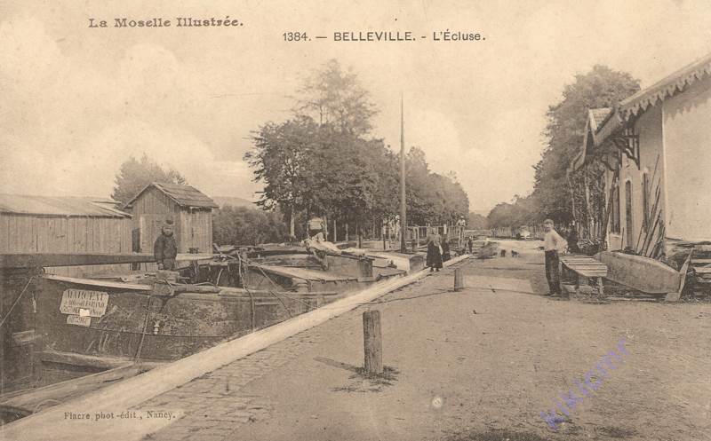 Une belle carte postale d'une écluse de la première canalisation de la Moselle, au gabarit Freycinet, avec une péniche dont la devise, le matricule et le nom du propriétaire sont clairement lisibles :