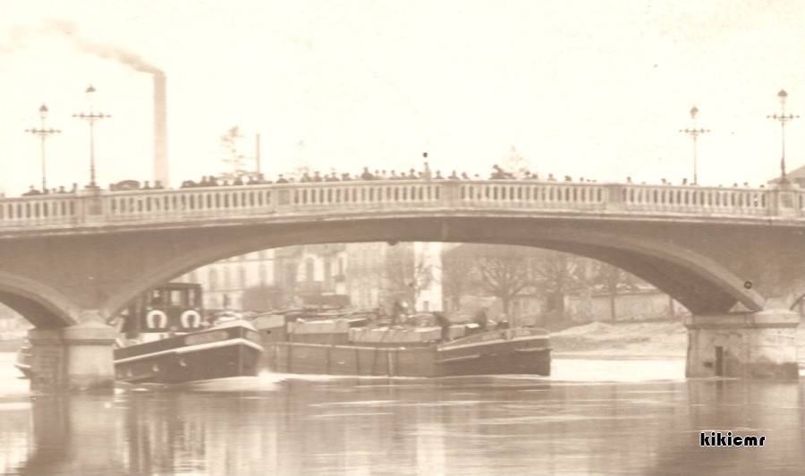 J'ai du mal à comprendre ce qu'on voit, sur cette photo : le DOUBS est tiré par le côté, c'est ça ? est-ce une mise à l'eau ? Le quai est en pente... Si on regarde les piles du pont, on voit des marques laissées par l'eau, ça veut peut-être dire qu'il y a eu une crue juste avant. Et au premier plan au sol, ça paraît bien mouillé, comme si l'eau venait juste de se retirer, n'est-ce pas ? Ne peut-on pas imaginer que le DOUBS s'est retrouvé en fâcheuse posture sur le quai lors d'une inondation, et que le LUCILINE est venu le tirer de là ? et c'est pour ça qu'il y a de nombreux badauds sur le pont et les quais...Sur la photo, le