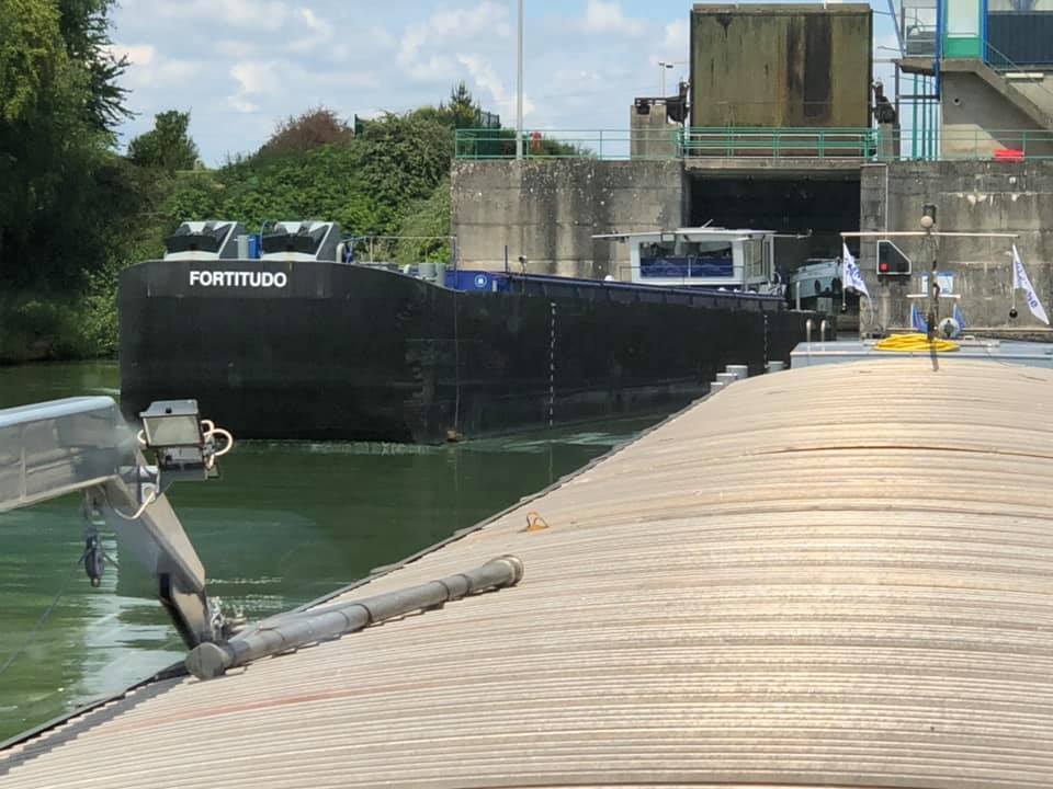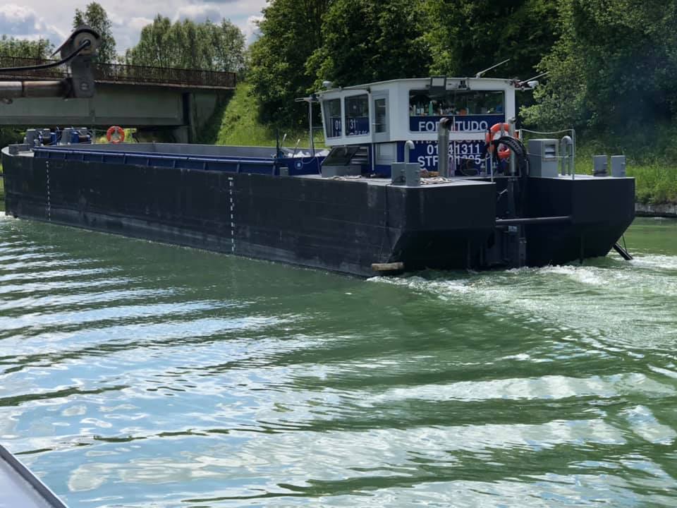 Il a fait un Strasbourg - Dunkerque au mois de mai, avec une pièce, je crois un échangeur (thermique ?). Il devait passer par les canaux mais un arrêt de navigation au plan incliné d'Arzviller l'a obligé à passer par le Rhin. Là, sur les photos, c'est le retour à vide de Dunkerque pour aller charger à Corbeil, une pièce pour Cattenom (Moselle).