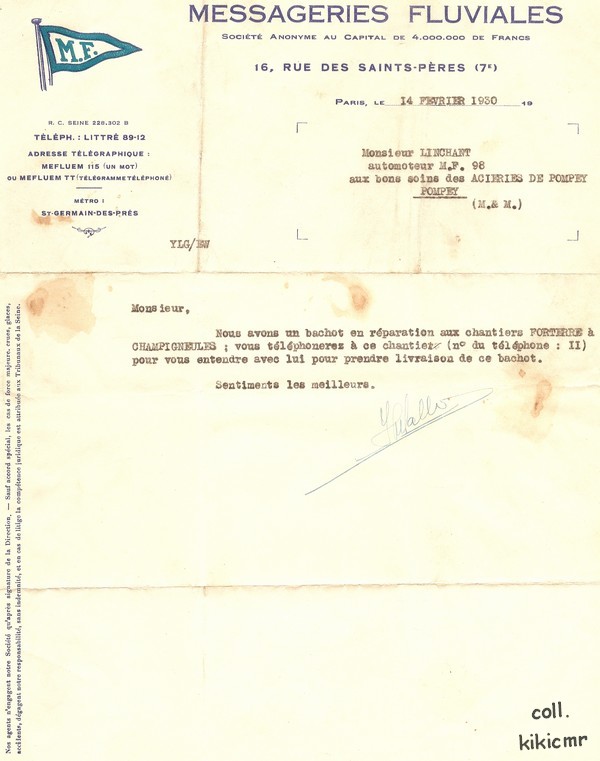 Je soussigné déclare capitaine Linchant automoteur MF98 appartenant aux Messageries fluviales 16 rue des Saints-Pères Paris 7eme. Aujourd'hui 11 juillet 1930 vers 17h30 en rentrant dans la petite écluse des Mureaux alors qu'il s'y trouvait déjà trois bateaux, 2 sur la droite et 1 sur la gauche, ayant débrayé assez tôt pour ne pas venir trop vite dans l'écluse, j'ai été emporté par l'aÿ et j'ai touché sur la masse de gauche, ce qui a renvoyé le nez vers la droite. J'ai mis un fil de fer mais pas assez vite pour éviter d'endommager le bachot du bateau DURANCE, appartenant à Nauwaere, de Hingene (Belgique, province d'Anvers, entre Tamise et Wintam