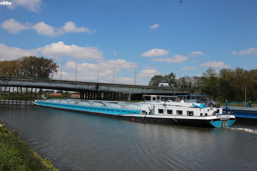 Manu Forti , 84,80 x 9,60 x ? , ? , Bouwjaar 2005 , Werf Leninskaya Kuznitsa Shipyard in Kiev ( Ukraine ) en Bodewes in Millingen aan de Rijn ( Nederland ) , 1000 pk Cummins en 530 pk DAF – Ballegooy boegschroef , ex Amira , ex Iris , eigenaar Carpe Diem Shipping in Papendrecht , ENI 02327263