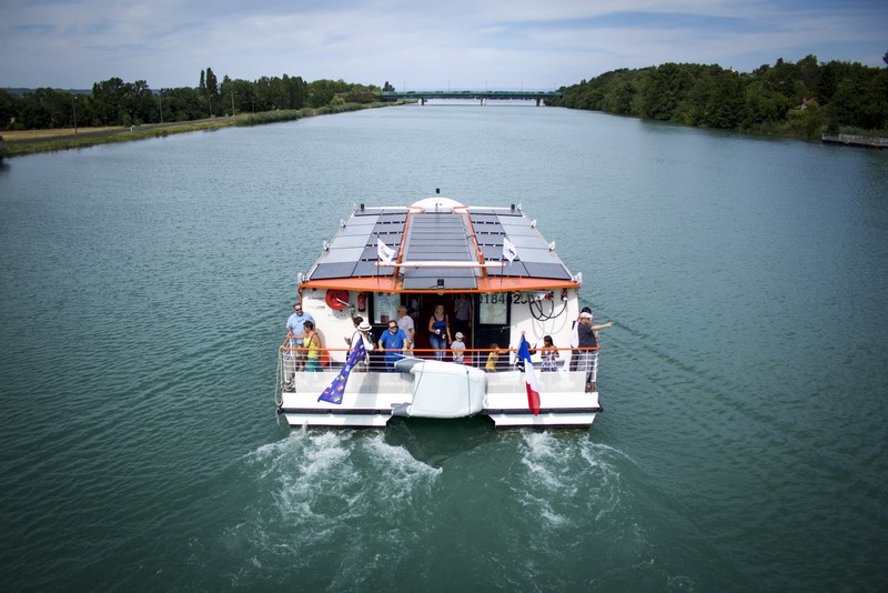 Propulsion 100% électrique , 2 X 35 KW , 12 KM / h maxi , autonomie 6 h dim 18 X 7 m