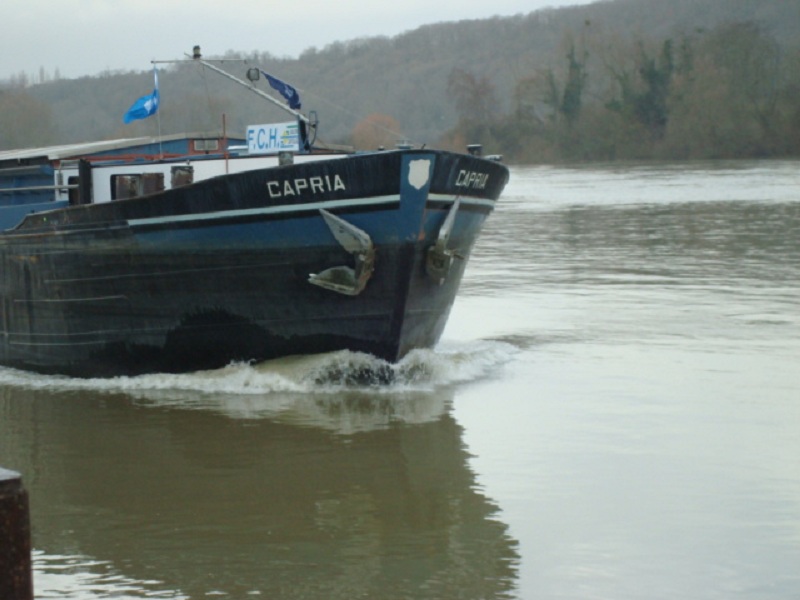 CAPRIA en pousseur avec sa barge THE LANDING BEACHES chargé à l'aval de l'écluse de Champagne sur Seine et à Montereau dans la passe des avalants .....oups!!!