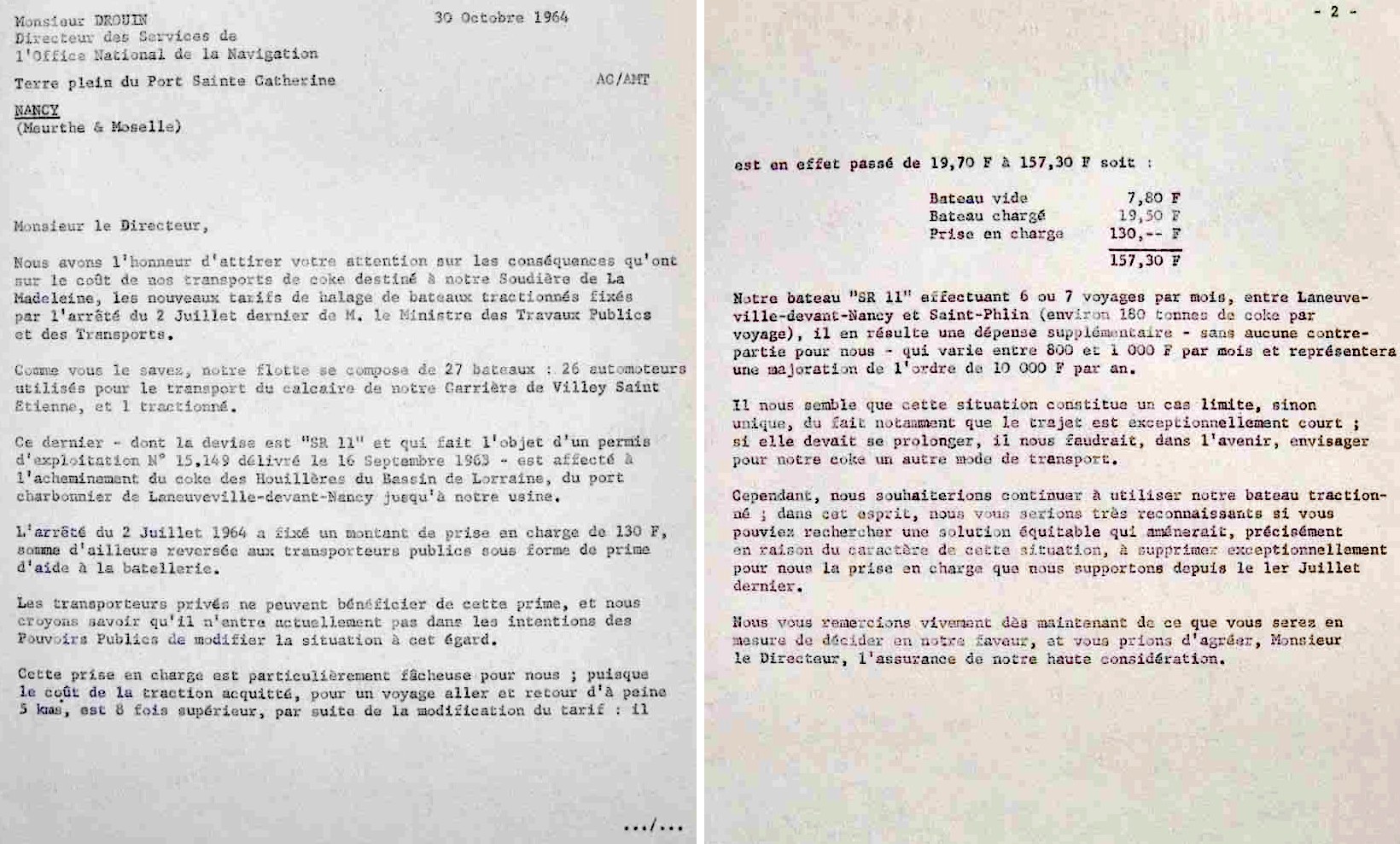 Voici une lettre adressée par les Soudières Réunies au directeur de l'Office National de la Navigation de Nancy, au sujet de la création en 1964 d'une prise en charge dans les tarifs de traction, s'ajoutant au prix au kilomètre, qui pénalise fortement le transport de coke du SR11 du fait de la très faible distance parcourue :
