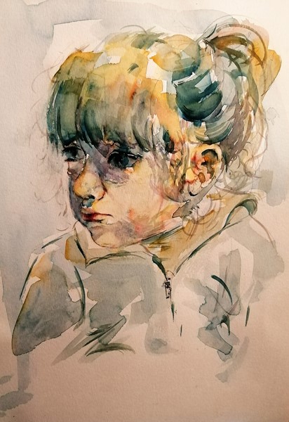 Aquarelle, craie blanche et encre aquarélable.