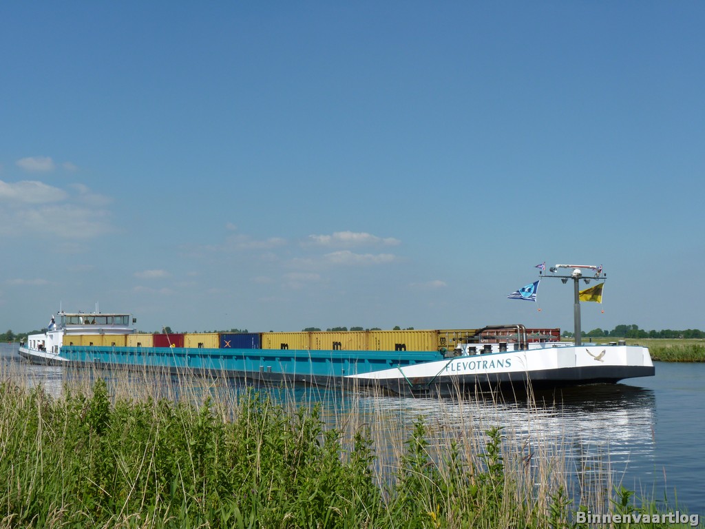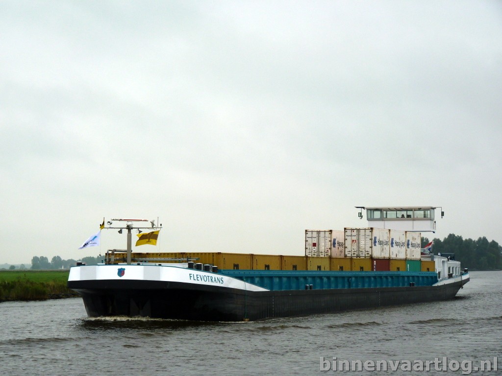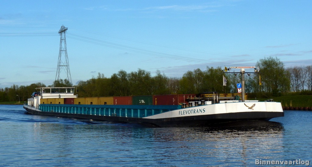 Flevotrans , 84,65 x 9,60 x 2,94 , 1577 ton , Bouwjaar 2002 , Werf Leninskaya Kuznitsa Shipyard in Kiev ( Ukraine ) en Afbouwwerf Damen in Bergum ( Nederland ) , 1000 pk Cummins en 480 pk DAF – Ballegooy boegschroef , eigenaar Vof. Flevotrans (A. de Jong) in Swifterbant , ENI 02210941