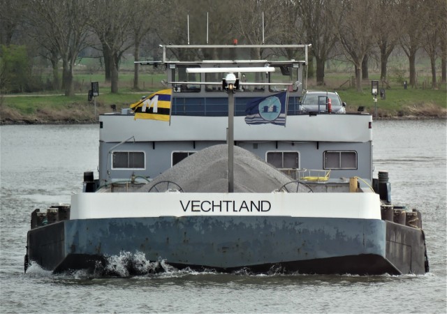Vechtland , 85,35 x 11,39 x 3,40 , 2262 ton , Bouwjaar 1981, Werf Ruhrorter Schiffswerft in Duisburg ( Duitsland ) , 2 x 1220 pk Caterpillar , ex Pavo , ex Helios , ex Bison , eigenaar Vonks Handel & Transport BV in Arnhem , ENI 02318395