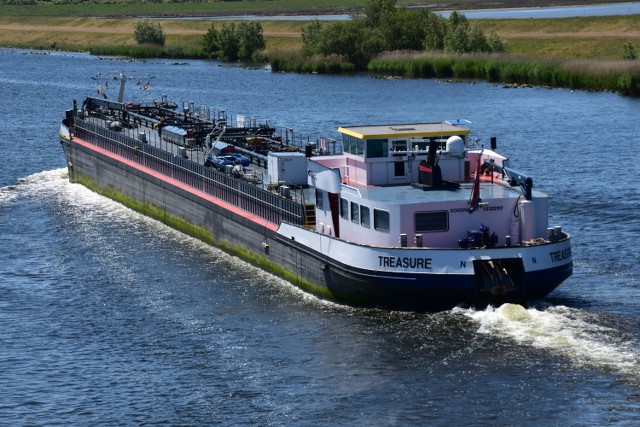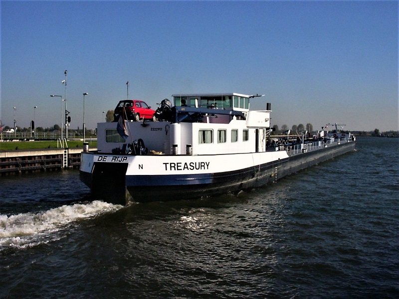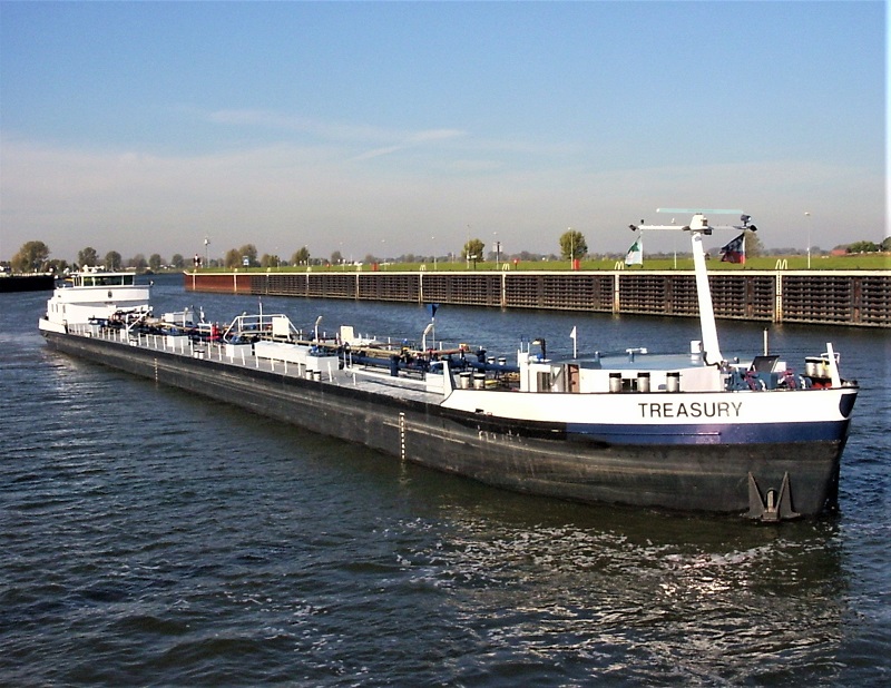 Treasure , 109,34 x 9,58 x 3,20 , 2214 ton , Bouwjaar 1973 , Meidricher Schiffswerft in Duisburg ( Duitsland ) , 1278 pk Mitsubishi en 320 pk ? boegschroef , ex Bodensee , ex Hazard , eigenaar Dari BV in Dordrecht , ENI 02322917