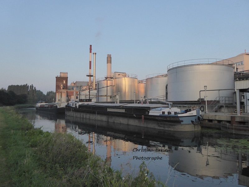 TYCHE revenait de Zeebruges alors qu'il était dans sa période Wavrin, mais il était passé au chantier de ce port pour l'installation d'une grue de voiture. A noter qu'ils quittent l'usine une fois vides en marche arrière, y compris le passage de l'écluse de Marquette, jusqu'à ressortir dans la Deûle. Et pour passer les ponts de la Marque canalisée, ils ballastent dans leurs cuves à mélasse avec de l'eau propre traitée par l'usine.