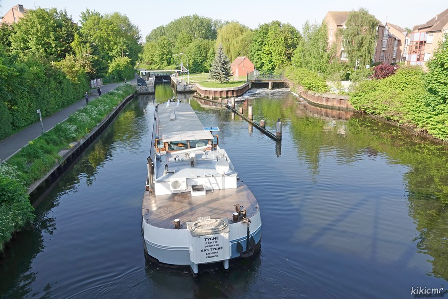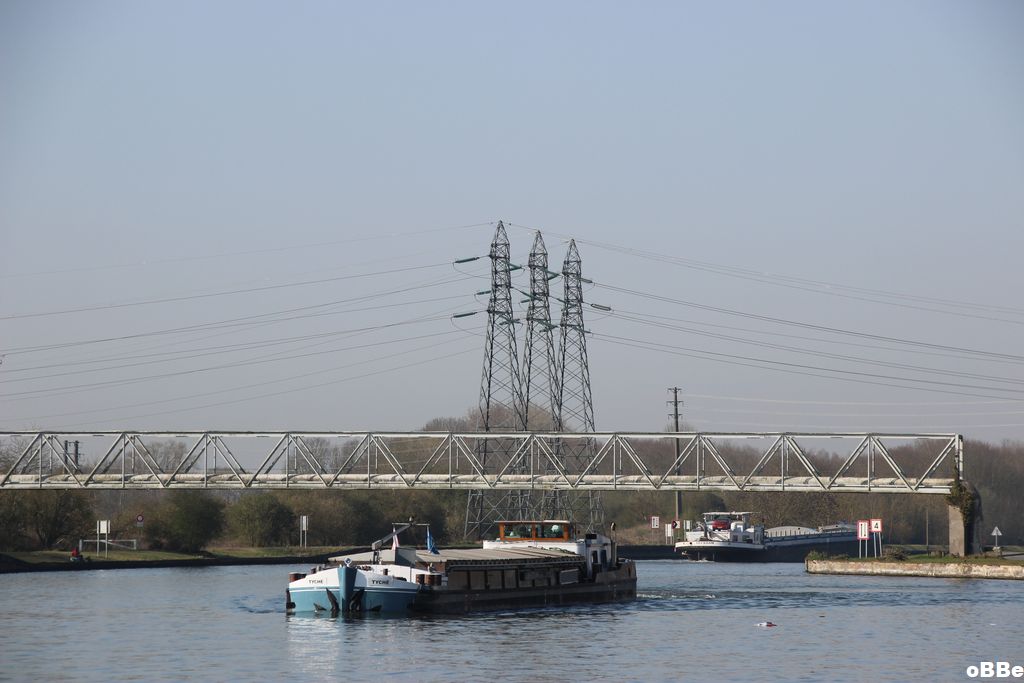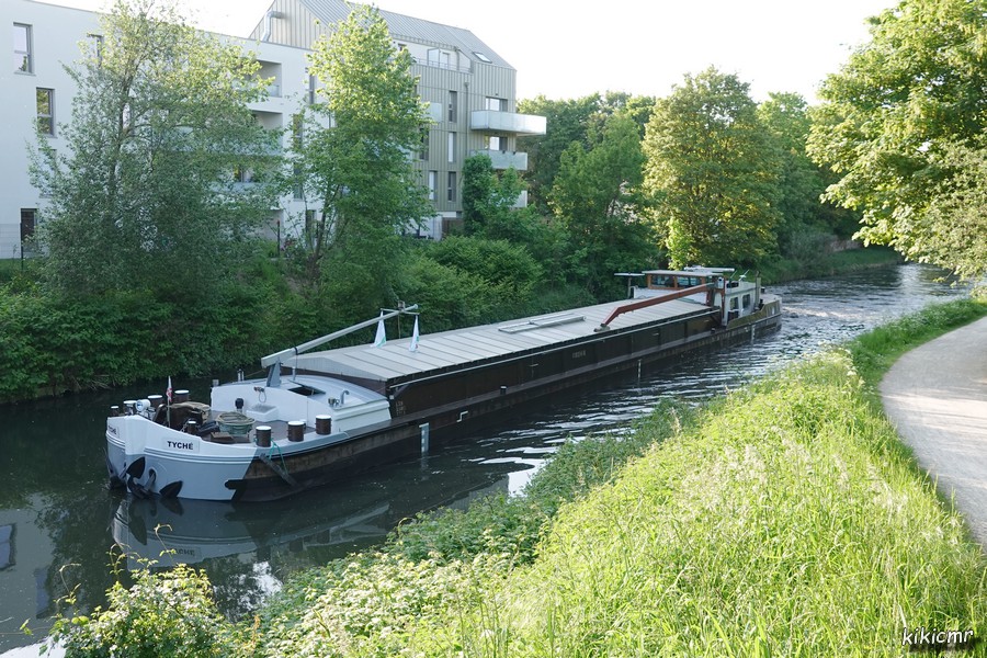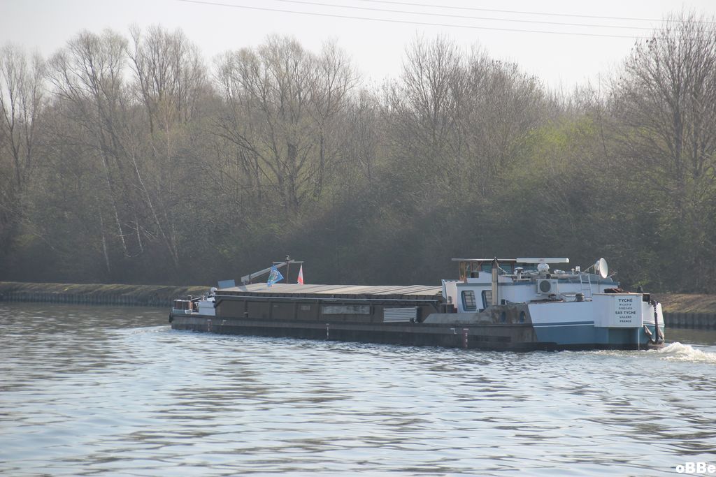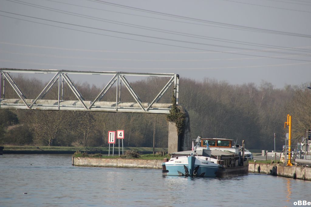 TYCHE en navigation sur la Marque canalisée pour rejoindre l'usine Lesaffre de Marcq-en-Barœul, en haut à l'écluse de Marquette, la seule qu'il franchit sur le petit gabarit sur ce service, et en bas au niveau de la passerelle Monplaisir, entre Marquette-lez-Lille et Marcq-en-Barœul :