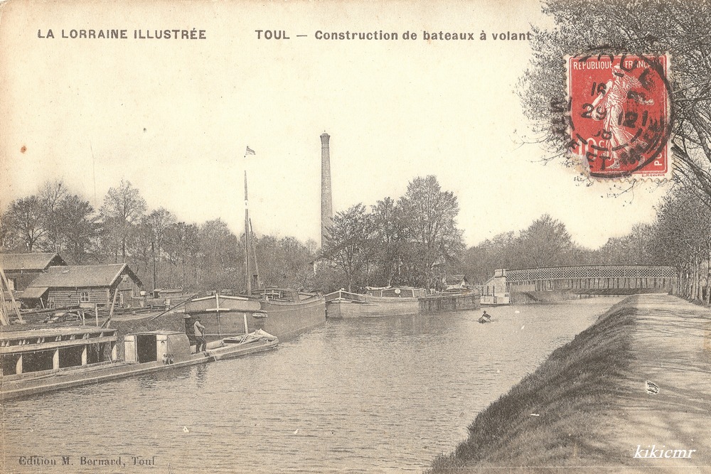 - une carte postale écrite et postée le 29 décembre 1908 : La Lorraine illustrée - Toul - Construction de bateaux à volant - Édition M. Bernard, Toul :