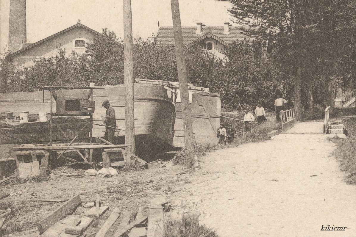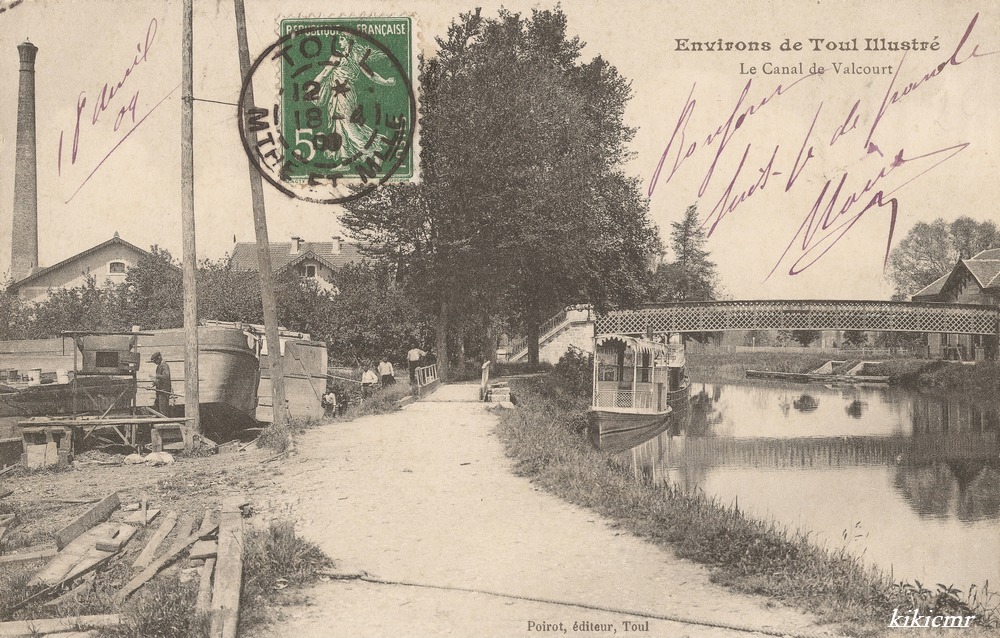- une deuxième carte postale, postée le 18 avril 1909 : Environs de Toul illustré - Le canal de Valcourt ; cette fois la photo est prise de l'autre rive, plus proche du chantier, on voit l'entrée de la cale, avec une passerelle qui assure la continuité du chemin de halage ou de contre-halage. On voit bien le cul d'un bateau qui est sur la cale, penché pour travailler sur le fond :