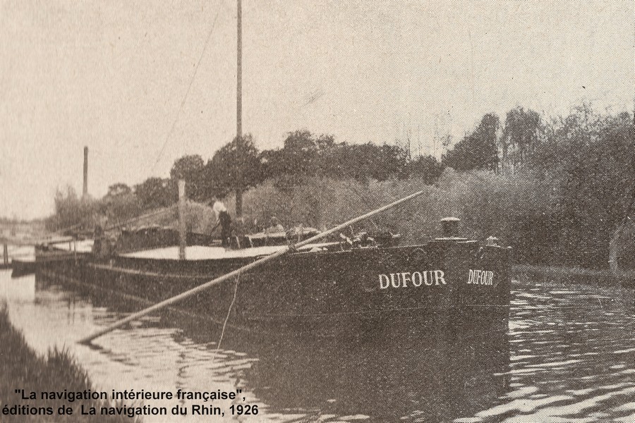 La légende indique : « Péniche DUFOUR de la Société franco-suisse de Navigation, sur le canal du Rhône au Rhin ».