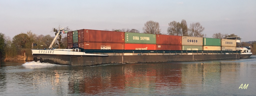 Dans le chapitre 6, d’ ”Une vie sur l’eau”, De Paris au Havre, attendre, toujours attendre”, c’est sur ce CYCLONE que l’auteur fait ce trajet, avec 3 x 3 x 6 conteneurs vides, chargement impressionant sur ce bâtiment (je résume) de 105 x 9,5 m, mu par 1500CV.