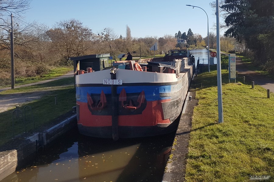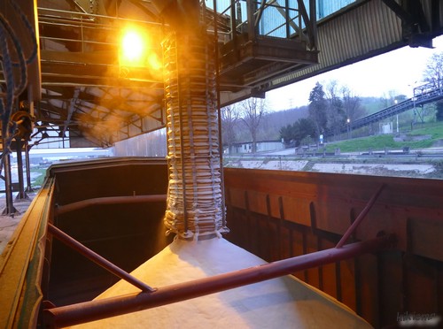 NOBIS, c'est un peu un bateau historique, maintenant : en effet, c'est lui qui a été le dernier à charger à la Solvay à Dombasle. Après des milliers et des milliers d'autres, il n'y en a plus eu après ce 3 avril 2019 :