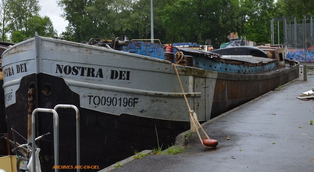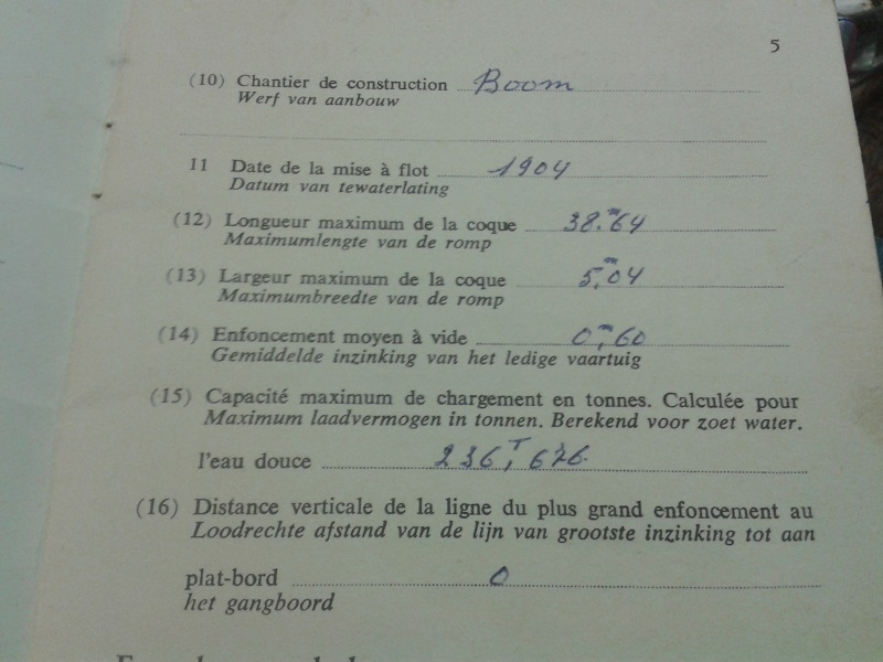 La deuxième du chantier boom, construite en 1904, devise "Vale dubei" en 1904, "Germaine" en 1932 en enfin"Nostra Dei" en 1968. Je suis aussi Chaudronnier/Soudeur, avec une équipe on effectue des restauration de péniche! On convoie aussi des péniche dans toute le France! Récemment nois avont convoyer un 52m de Compiègne à Bordeaux et nous l'avont coupez en deux en flottaison!!........ Comment puis je faire pour trouver leurs chantier de fabrication de tout les chantiers de boom? Est il possible de consulter des archives? J'ai acheté ces deux péniche près de Paris, elle etais a l'abandon et délabré! On leurs donne une seconde vie en quelques sortes!! Elle n'ont jamais etais immatriculé en France, c'etais des péniche fantôme depuis 30ans! Si vous avez quelques info a me donner de plus je suis preneur! Merci" ....Ceci sont le peu d'information sur la péniche "Nostra Dei"! Jr regarerai demain pour l'immatriculation poinçonné je pense les avoir vue! Je vous enverrai aussi les photos des papiers belge du "Dajo" et des photos du bateau! Merci de bien vouloir poster ma demande de renseignements!