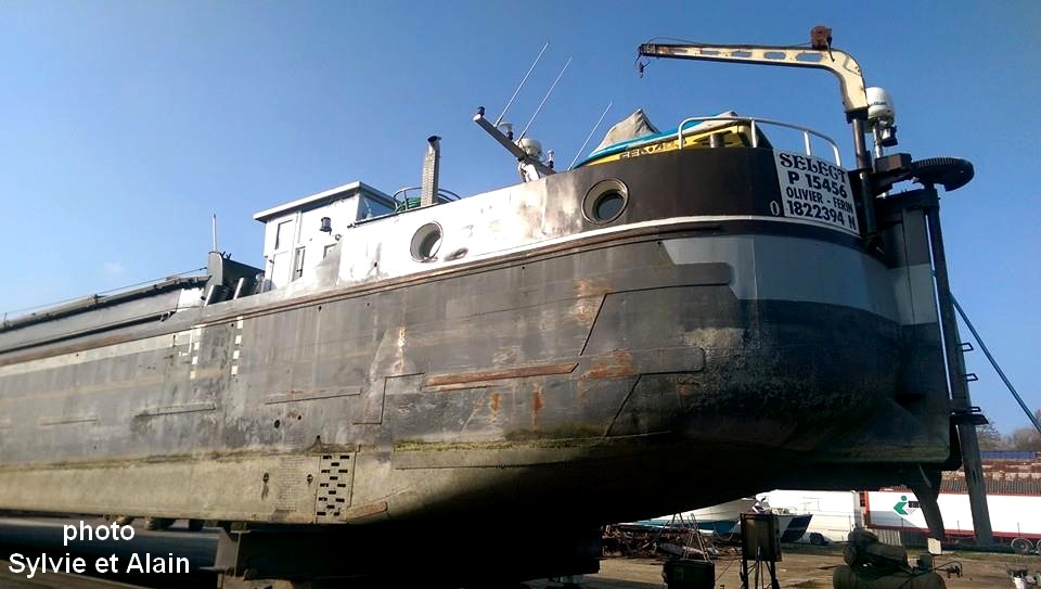 Depuis l'automne 2013 qu'il ne navigue plus en commerce, mais Alain et Sylvie habitent toujours dessus, et hier il est monté sur cale au chantier de Thomery pour le communautaire :