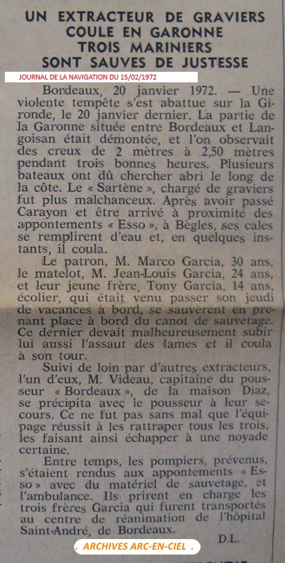 Alain Videau dans son livre '' Dans le sillage des gabares '' (page 313) raconte comment il a sauvé in-extremis l'équipage du SARTENE qui venait de couler vers Bègles.