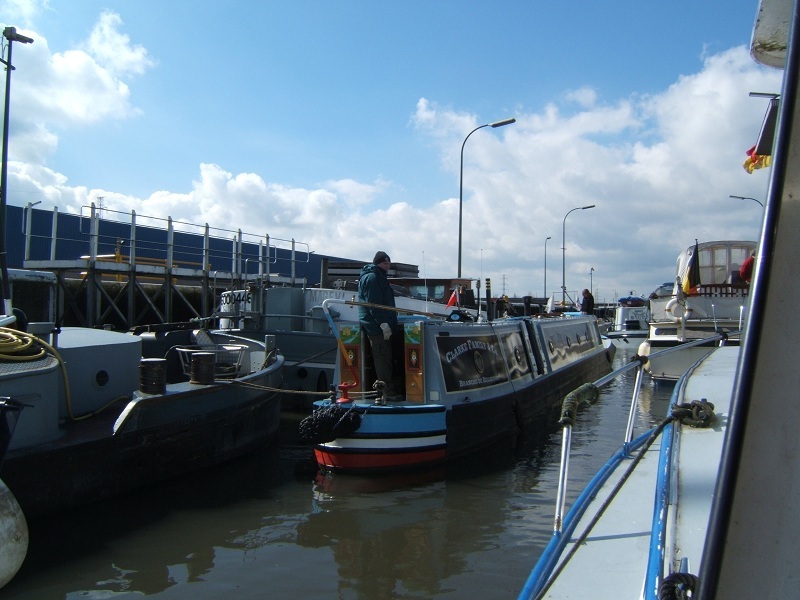 En agrandissant on peut lire son ancienne devise. A côté de lui le narrowboat Sika. Ecluse d'Harvé, canal du Centre (Belgique)