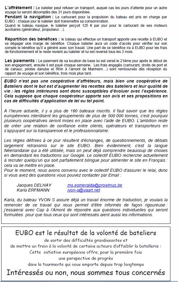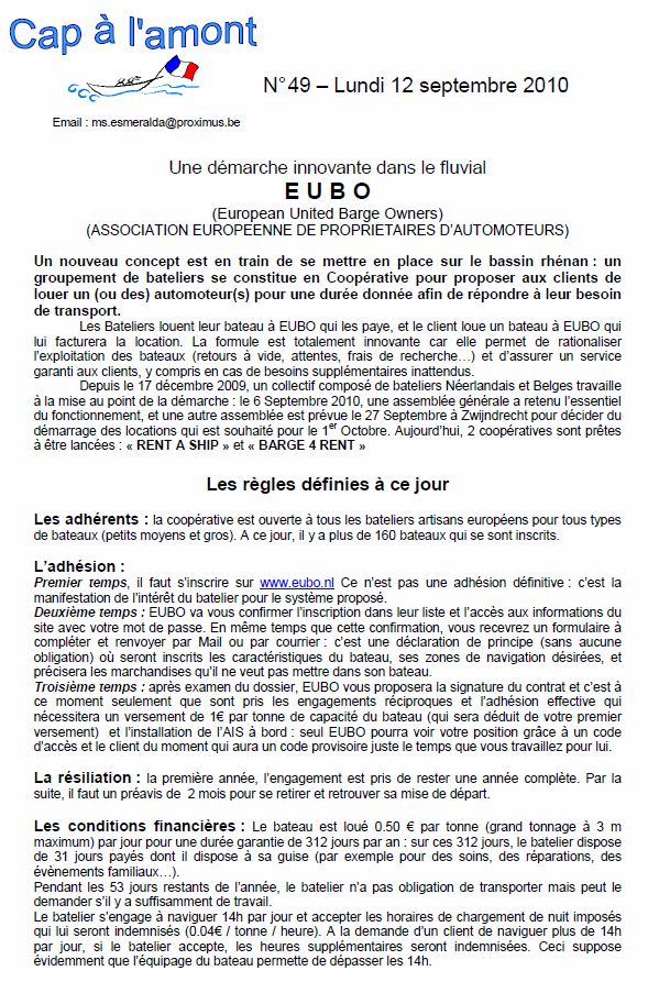 Cap à l'amont N°51 (Bord à bord) traite de la Coopérative Eubo.Jacques Delhay développe des arguments de poids que je partage complétement et je suis étonné de constater très peu de réaction parmi les participants. La Batellerie Artisanale traverse un passage difficile avec des effectifs qui se réduisent d'année en année. Le regroupement de l'ensemble tel que le suggère Eubo devrait permettre une adaptation au marché libre et ouvrir la voie à un avenir plus prometteur.