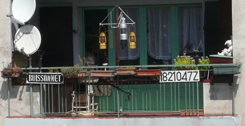 Le balcon avec une pancarte BUISSONNET est l'endroit où habitent aujourd'hui mes parents