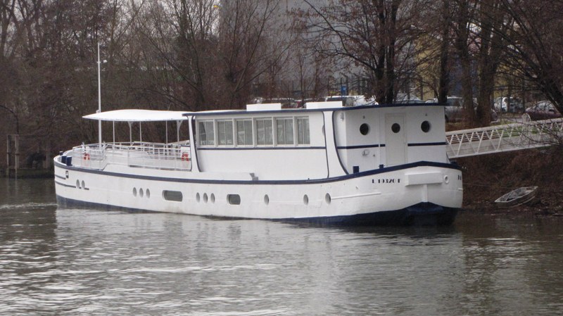 Le J.A.G est stationné à Colombes en aval du pont d'Argenteuil ,transformé en salle de réception