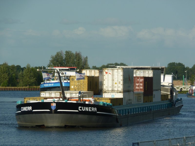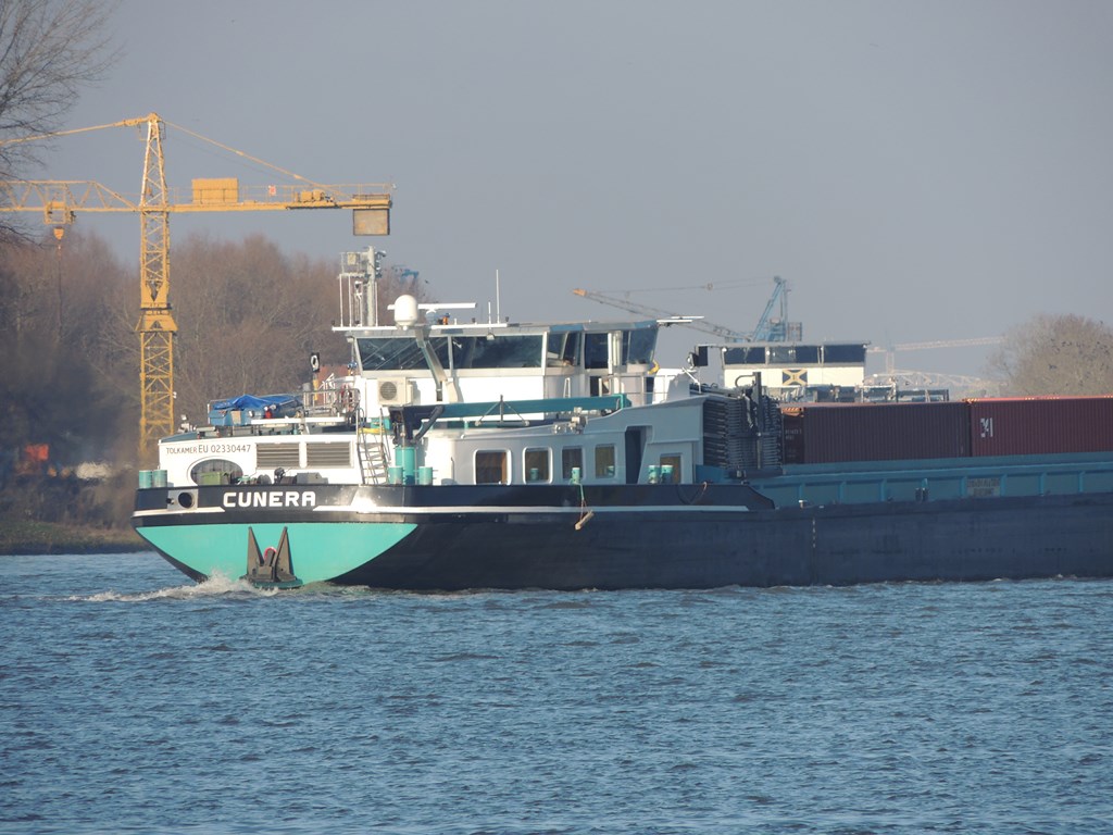 Cunera , 110,00 x 11,45 x 3,64 , 3247 ton , Bouwjaar 2008 , Werf Stig Jiangsu Sugang Shipbuilding in Yizheng ( China ) en Bayens BV in Raamsdonksveer ( Nederland ) , 1700 pk Mitsubishi en 571 pk Scania Veth-Jet boegschroef , eigenaar Cunera CV in Tolkamer , ENI 02330447