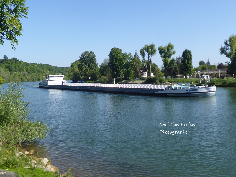 Voici le MAGNUM de passage mercredi à Thomery , pas de ronfles , les chevaux ne sont pas sortis, il va croiser le NECTON plein bac lui aussi qui marche tout aussi doucement dans ce bief au combien dangereux pour les bateaux lourdement chargés. On apprécie les dimensions du bateau en regardant le garage à voitures sur le logement , il me semble qu'il reste une place , bref ce n'est plus le MAGNUM au gabarit freycinet....