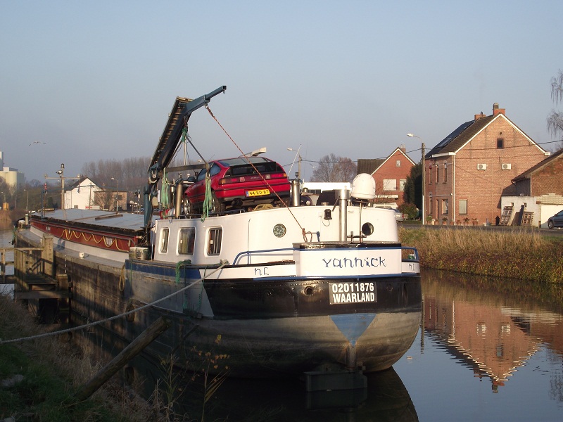 Yannick , en attente de chargement de malt à Wijgmaal près de Herent. Les fleurs de lys ont été enlevées par l'ancien propio, dixit, en néerlandais, Mme la batelière, pour faire des travaux ? Pour moi , il a voulu garder comme souvenir. Ingénieux la passerelle sur le bras de la grue lorsqu'on doit s'amarrer à un perré , à la place d'une sauterelle ?