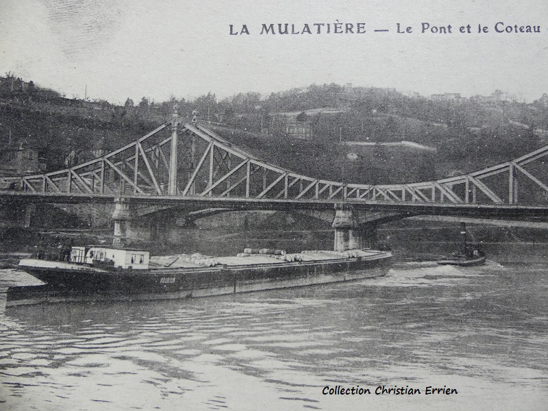 Vu l’année, 1920, la ROUBION a été tractée montante, par un remorqueur deux cheminées, disons le FRANCE, que l’on peut retrouver sur ce site, à l’écluse de La Mulatière située juste en aval de cette vue. La dite barque a été ensuite reprise par ce petit remorqueur pour remonter, peut-être, à travers Lyon, jusqu’au port de Vaise.