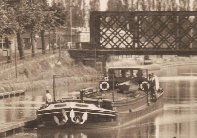 Elle est très jolie, cette CPSM du canal de Saint-Quentin : pour le groupe de Jeumont à bielles sur la rive d'en face, pour le Latil électrique à l'origine sur pneus que l'on voit ici modifié pour rouler sur rails face au photographe, pour le bateau qui entre dans le sas au premier plan, pour la brouette devant la guitoune de l'éclusier et aussi, bien sûr, pour le bateau amarré à la patte d'oie amont, dont on lit facilement la devise :