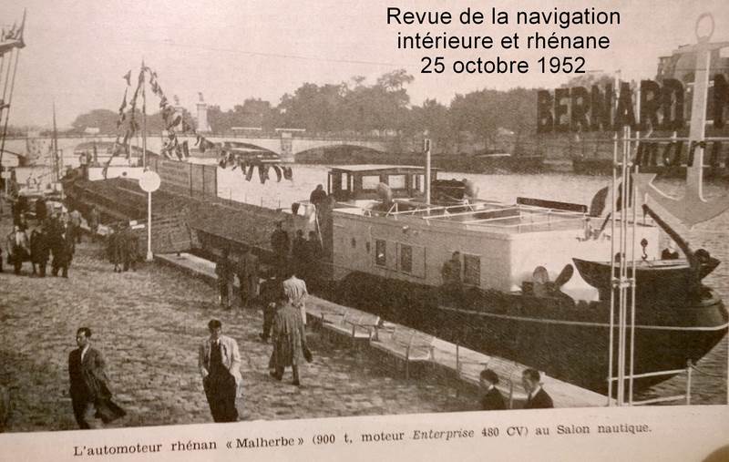 Le MALHERBE au XVIIIe Salon international des industries maritimes et fluviales (Paris, 27 septembre - 12 octobre 1952), photo parue dans la Revue de la navigation intérieure et rhénane du 25 octobre 1952 ; il est écrit qu'il a fait un "crochet" lors de son voyage de livraison entre Cherbourg et Rotterdam pour être là !