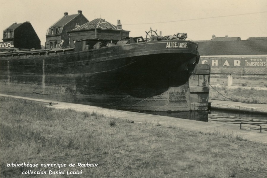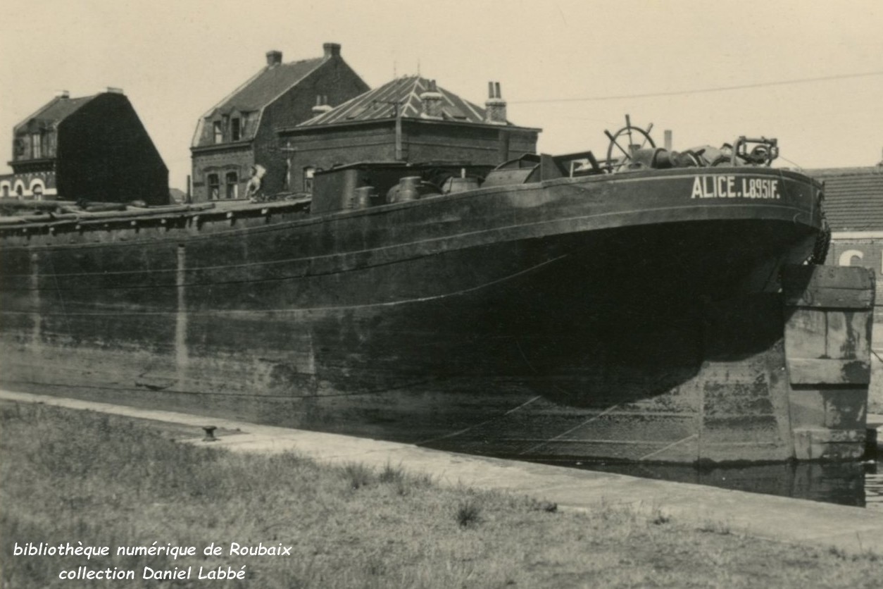 Elle provient de la collection Daniel Labbé, format 9 x 6cm ; la légende indique "La péniche "Alice" à quai sur le canal de Roubaix en 1935", mais ça a plutôt l'air d'être dans une écluse.