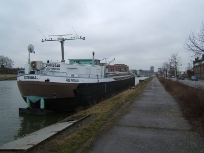 le Kendall immatriculé 6002148. Ici à Hasselt "Kanaal Kom" darse sur le canal Albert en février 2009 . La devise est forgée sur les fargues mais les lettres étaient peintes en blanc.