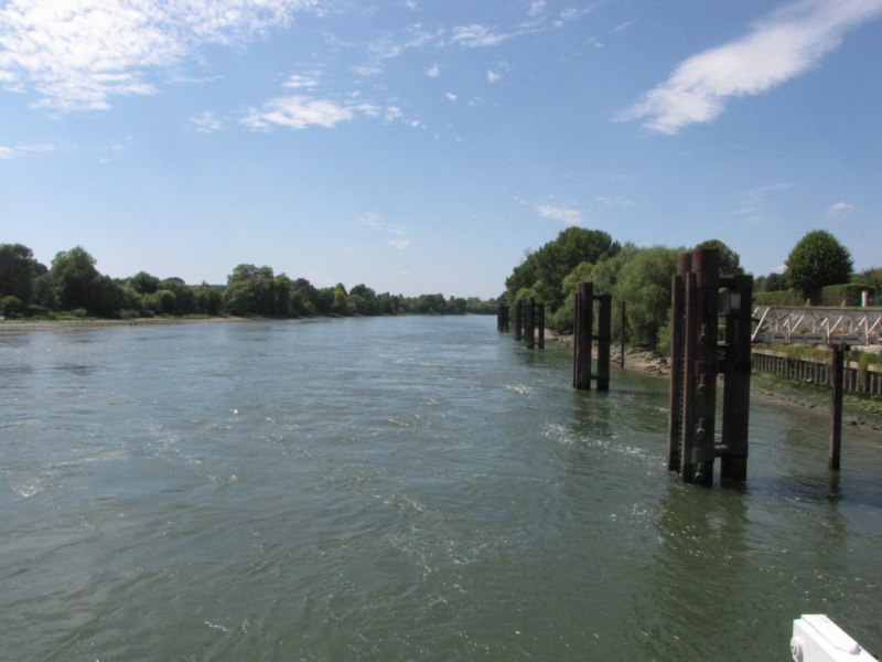 vue d'aval sur l'ouvrage ou l'on peut aussi voir a maree basse le courant traversié qui pousse les bateaux sur les nouveau pieux de stationnement
