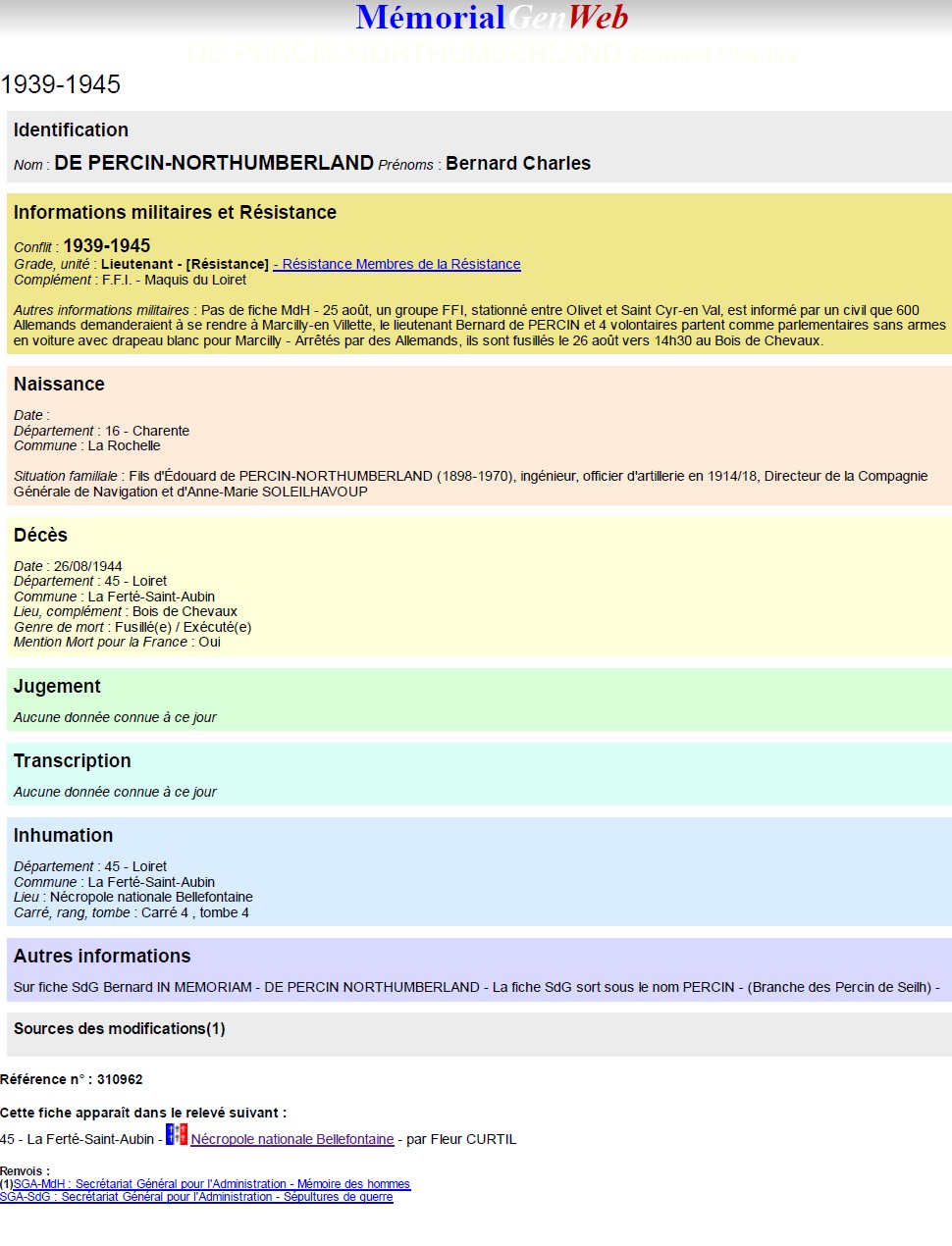 Leur chef, Bernard de Percin, ce garçon aux mains fines, un peu dégingandé, qui, revenant d’une expédition à Vitry, nous déclarait : « J’ai bien essayé de prendre un air de terroriste, avec ma mitraillette, mais je n’ai pas pu. ». Il était pourtant devenu un parfait maquisard, buvait du vin rouge et parlait comme un vieux Marsouin. Il avait toujours un sourire sur les lèvres, qui en faisait l’ami de tout le monde. C’était un idéaliste silencieux. Il n’a pas cru à la cruauté du boche. Plénipotentiaire, demandé par les Allemands qui voulaient se rendre, il est tombé sans arme, avec son drapeau blanc, lâchement assassiné près de La Ferté-Saint-Aubin.