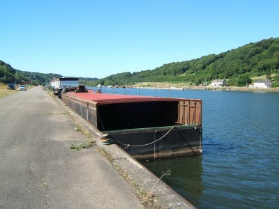 Le dimanche je suis souvent à Sclayn sur la Meuse. Pour le moment est amarré l'avant d'un 38m. coupé , le G. CORVOL pour transformation. Pas d'immatriculation ou autre détail lisible. J'ai appris par mon ami ,soudeur pensionné du chantier de Namèche, qu'il servira de ponton- terrasse pour un bateau événementiel garé au Grognon à Namur. L'arrière du bateau sera ou est déjà transformé en pousseur dans un chantier-atelier à quai à Namèche (rive droite)