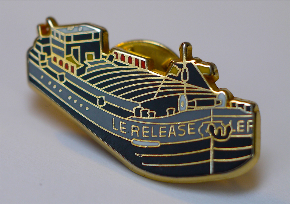 on peut trouver assez souvent un pin's du RELEASE sur e-bay ou delcampe..
