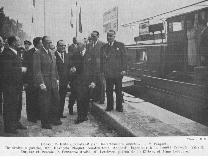 L'ELITE, construit par les Chantiers navals J. & F. Plaquet de Péronnes, était présenté au XVe Salon international des industries maritimes et fluviales, qui s'est tenu la première quinzaine d'octobre 1949 à Paris ; "La navigation du Rhin - Revue de la navigation intérieure" d'octobre 1949 nous en parle :