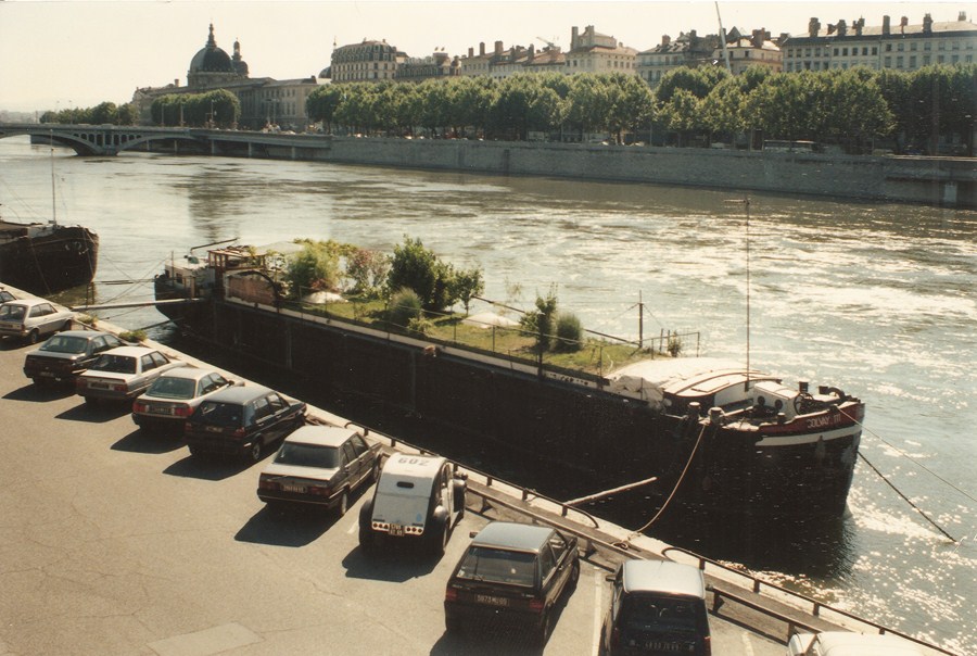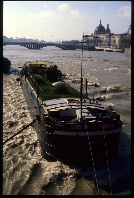 et une photo que j’ai prise en 1982, de la passerelle piéton qui enjambait le canal entre le chargement de soude en vrac et l’ancien chargement des cylindres de soude caustique (elle fut démontée début 1990), et que j’aime particulièrement, qui allie la flotte et l’architecture des installations, le