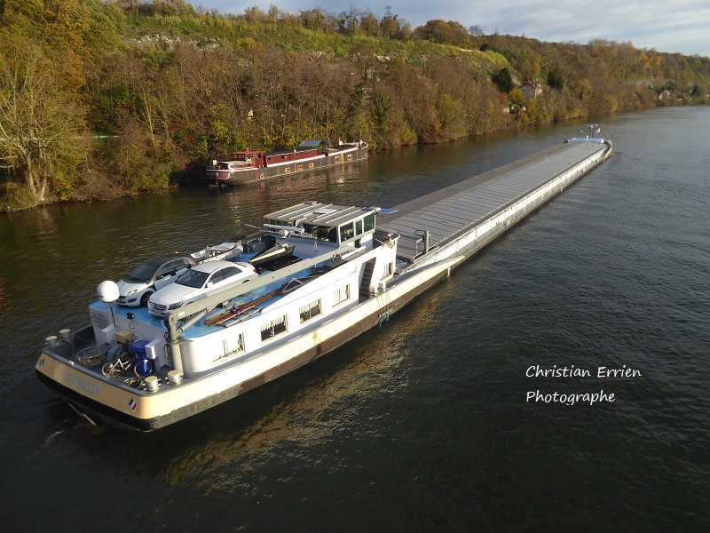 Le voici en navigation , pris ce matin depuis le pont et face au marché hebdomadaire. Les commerçants jouissent d'une vue extraordinaire ....