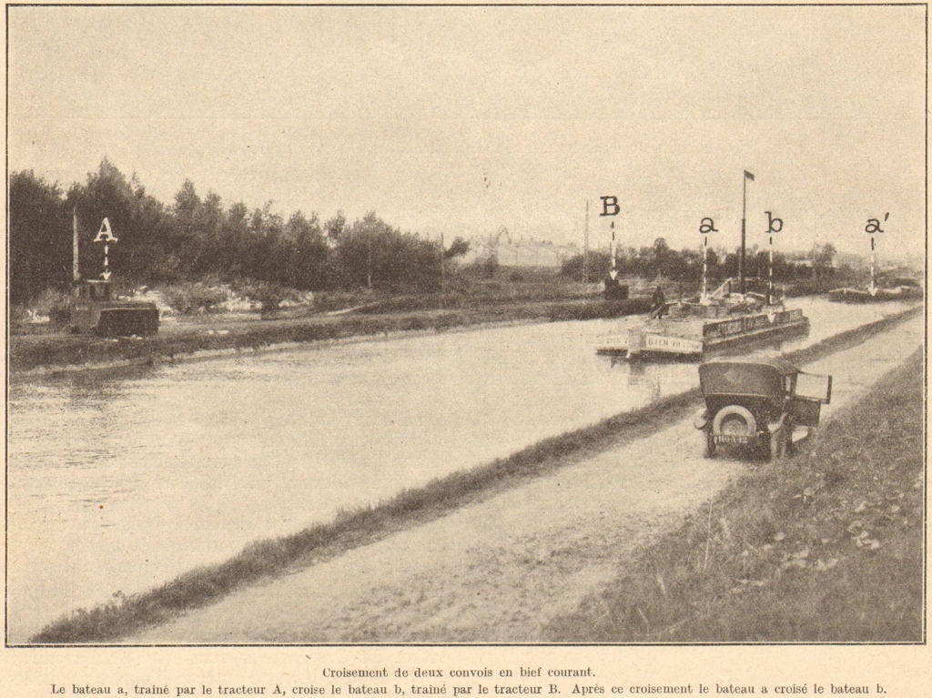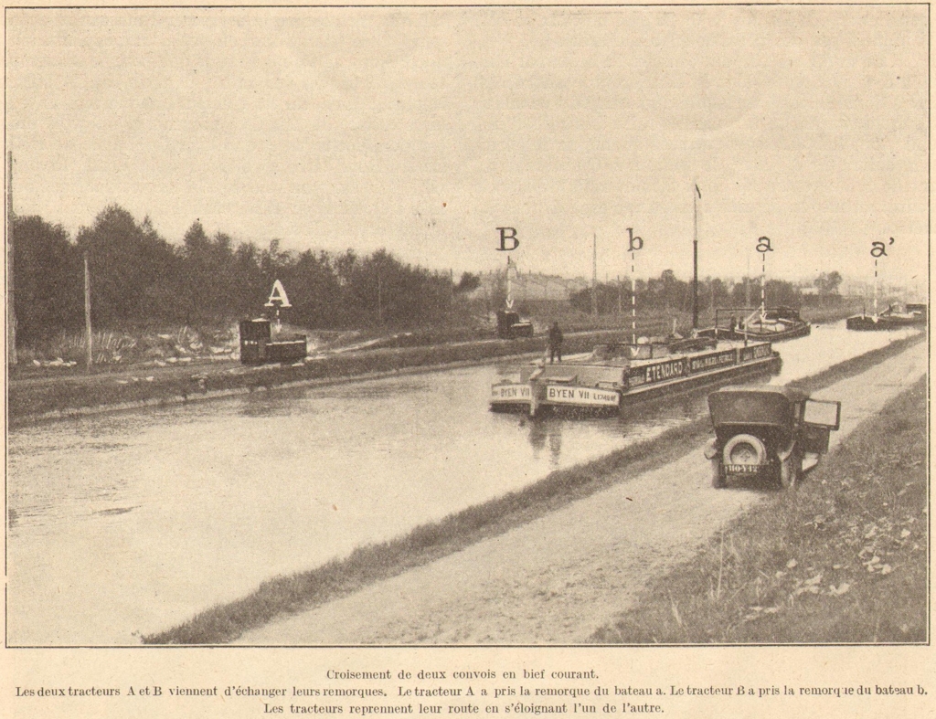 La photo est tirée de "La navigation intérieure française", numéro spécial de La Navigation du Rhin édité à l'occasion de l'Exposition Internationale de Navigation Intérieure et d'Exploitation des Forces Hydrauliques de Bâle en 1926 et illustre un article sur la traction mécanique des bateaux par tracteurs électriques sur rails.